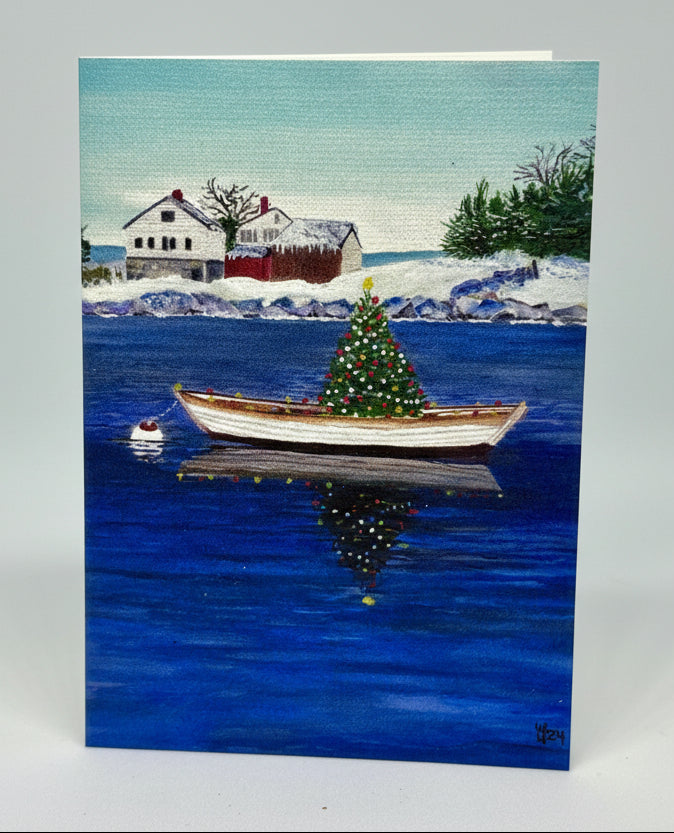 Celebrate a coastal Christmas with this hand-cut Maine rowboat card. A festive tree nestled in a classic dory captures the charm of New England holiday traditions, perfect for sharing seaside Christmas spirit with someone special.